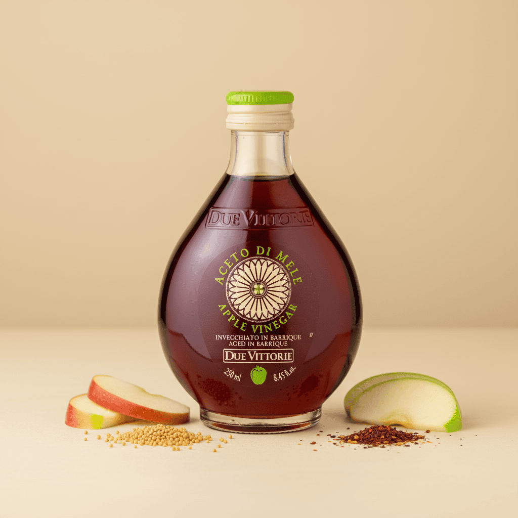Aceto di mele dal gusto delicato e fruttato, ideale per condire insalate, marinature e piatti leggeri.