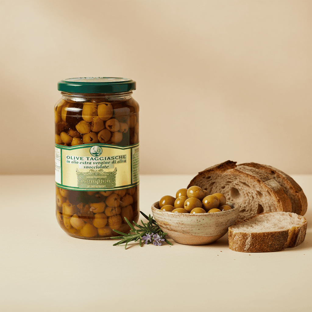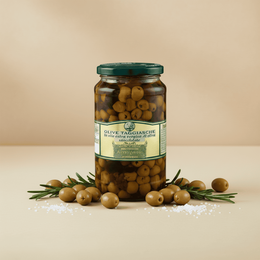 Olive Taggiasche liguri snocciolate e conservate in olio extra vergine di oliva. Dal gusto delicato e aromatico, ideali per antipasti, insalate, primi piatti e secondi di pesce o carne.