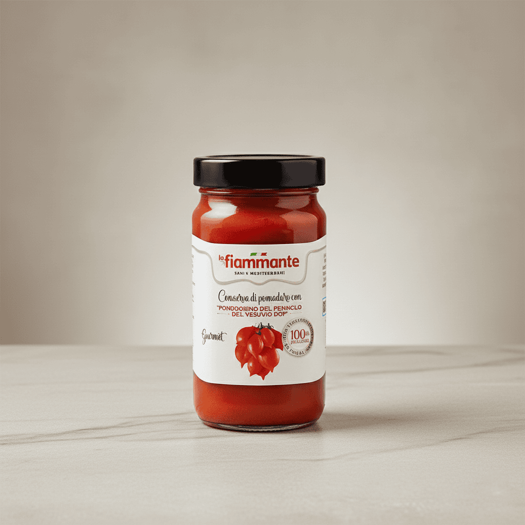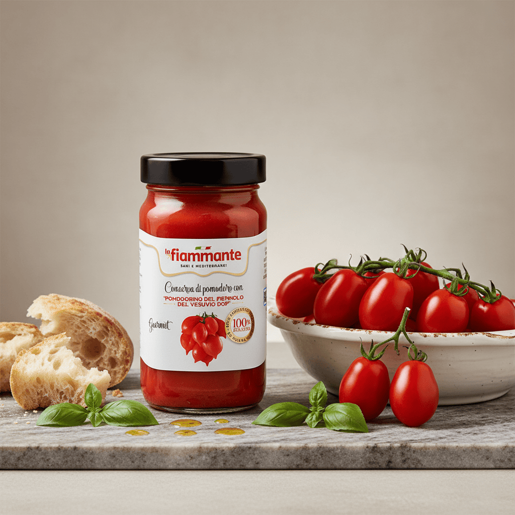Conserva di pomodoro con Pomodorini Piennolo del Vesuvio DOP in vaso, dalla consistenza soda e sapore concentrato, ideali per piatti tipici campani.