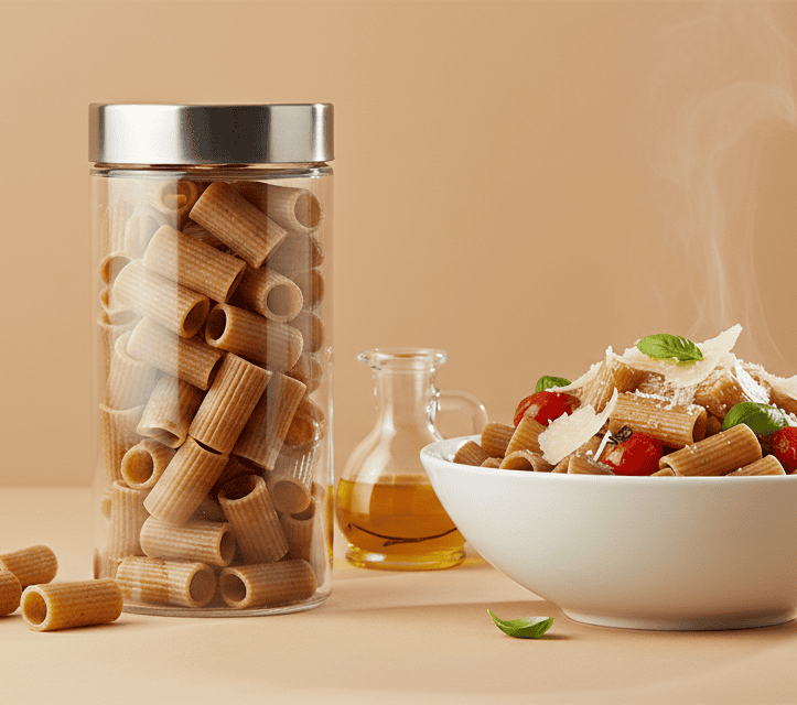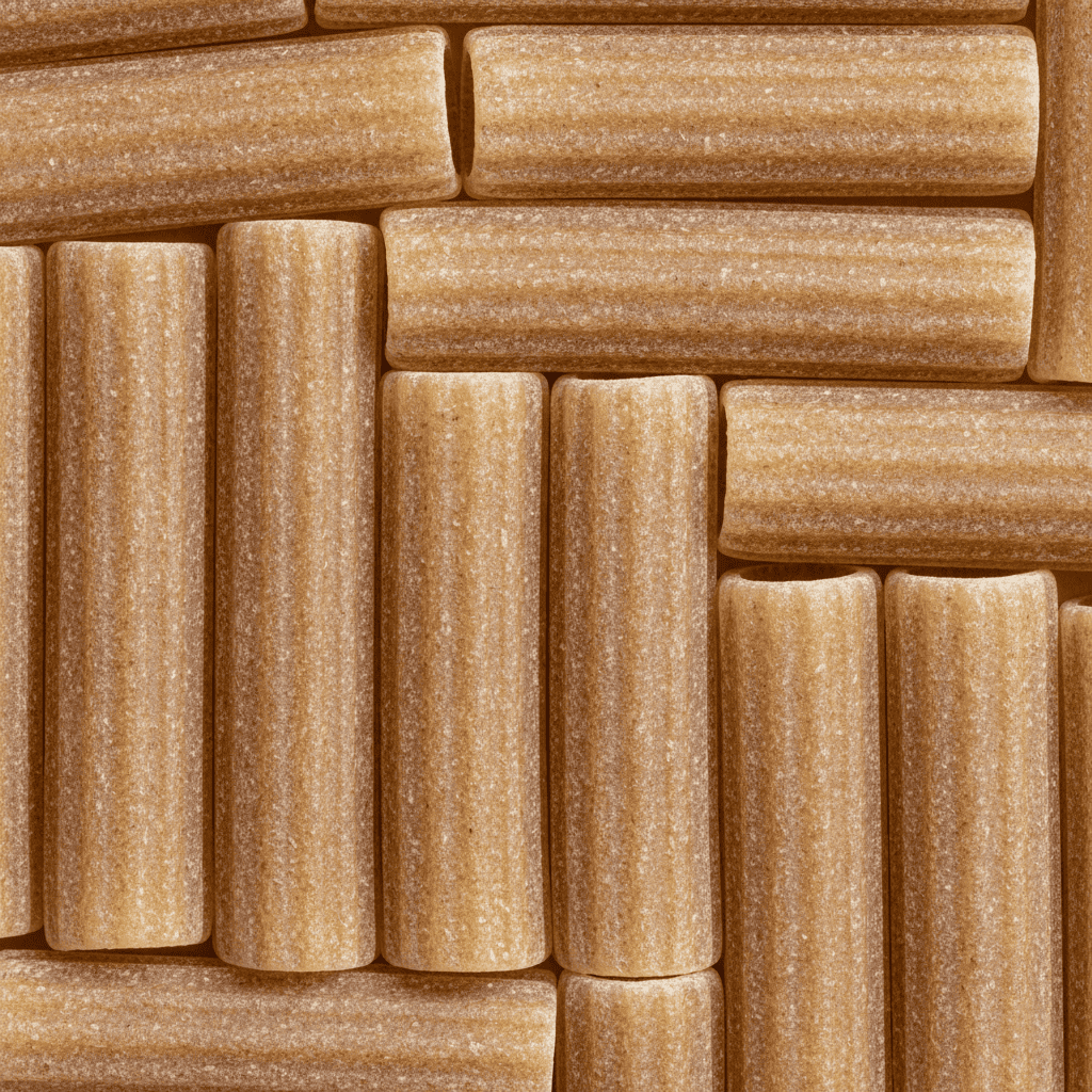 Mezzi rigatoni integrali di grano duro, pasta corta a righe, ideale con sughi corposi e densi.