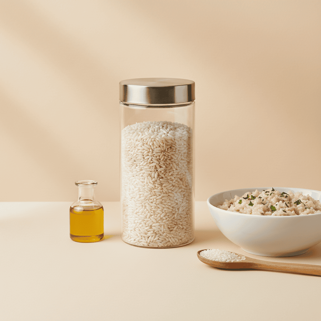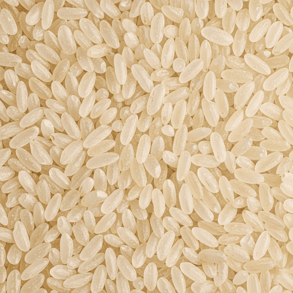 Riso Arborio Riserva, chicco grande e perlato, ideale per risotti cremosi grazie alla sua capacità di assorbire i condimenti.