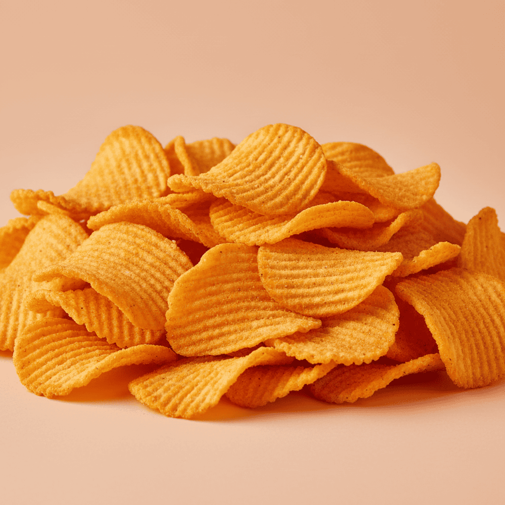 Snack croccante a base di patata e paprika, forma a conchiglia, perfetto come stuzzichino saporito.