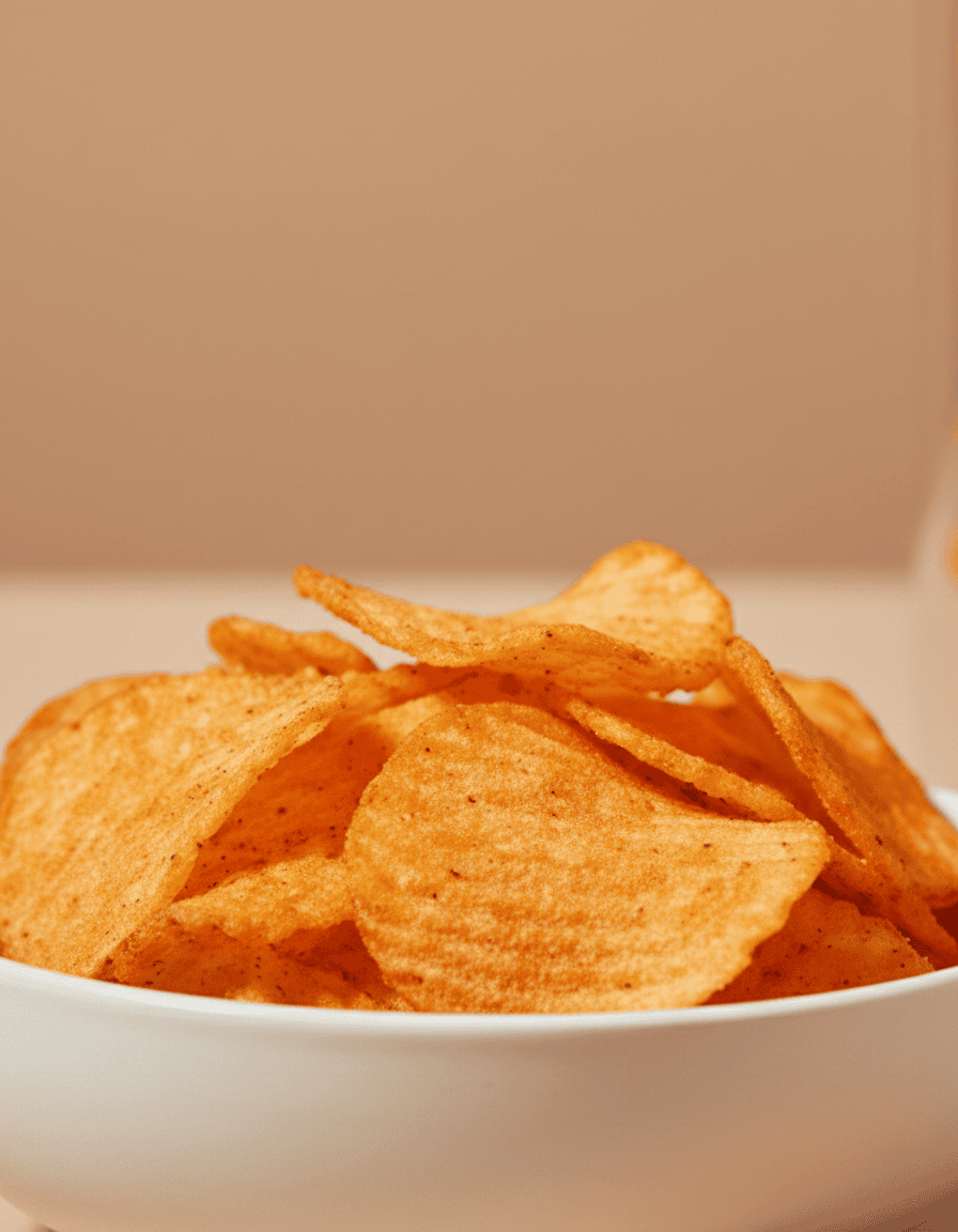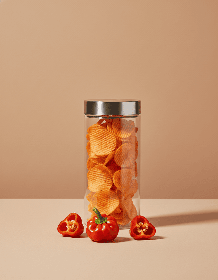 Patatine croccanti aromatizzate alla paprika, perfette come snack piccante da gustare da sole o come accompagnamento.