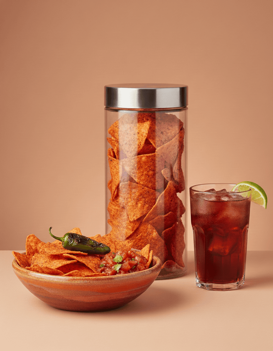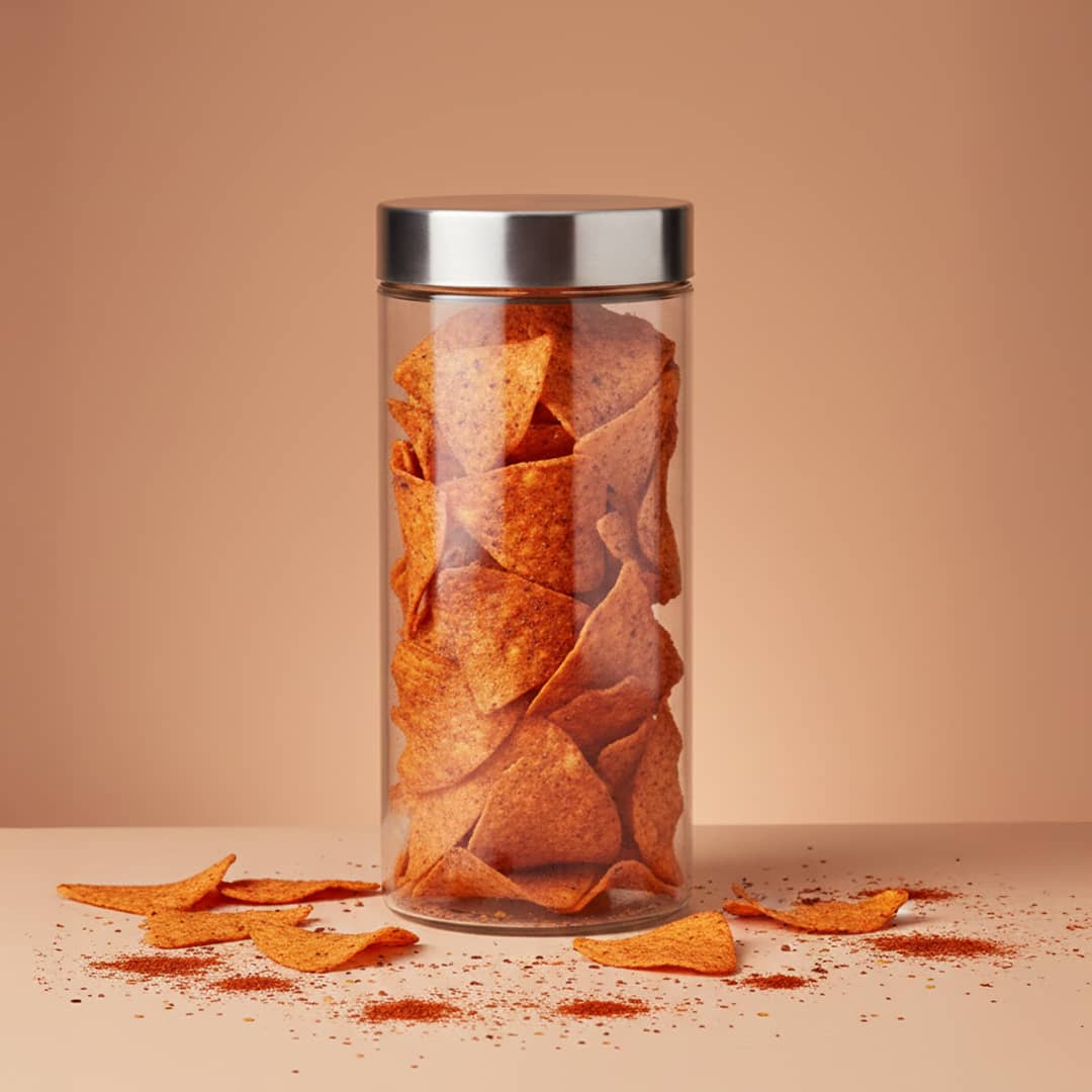 Tortilla chips piccanti (“Hot”), perfette da gustare da sole o accompagnate a salse, ideali per chi ama un tocco speziato.
