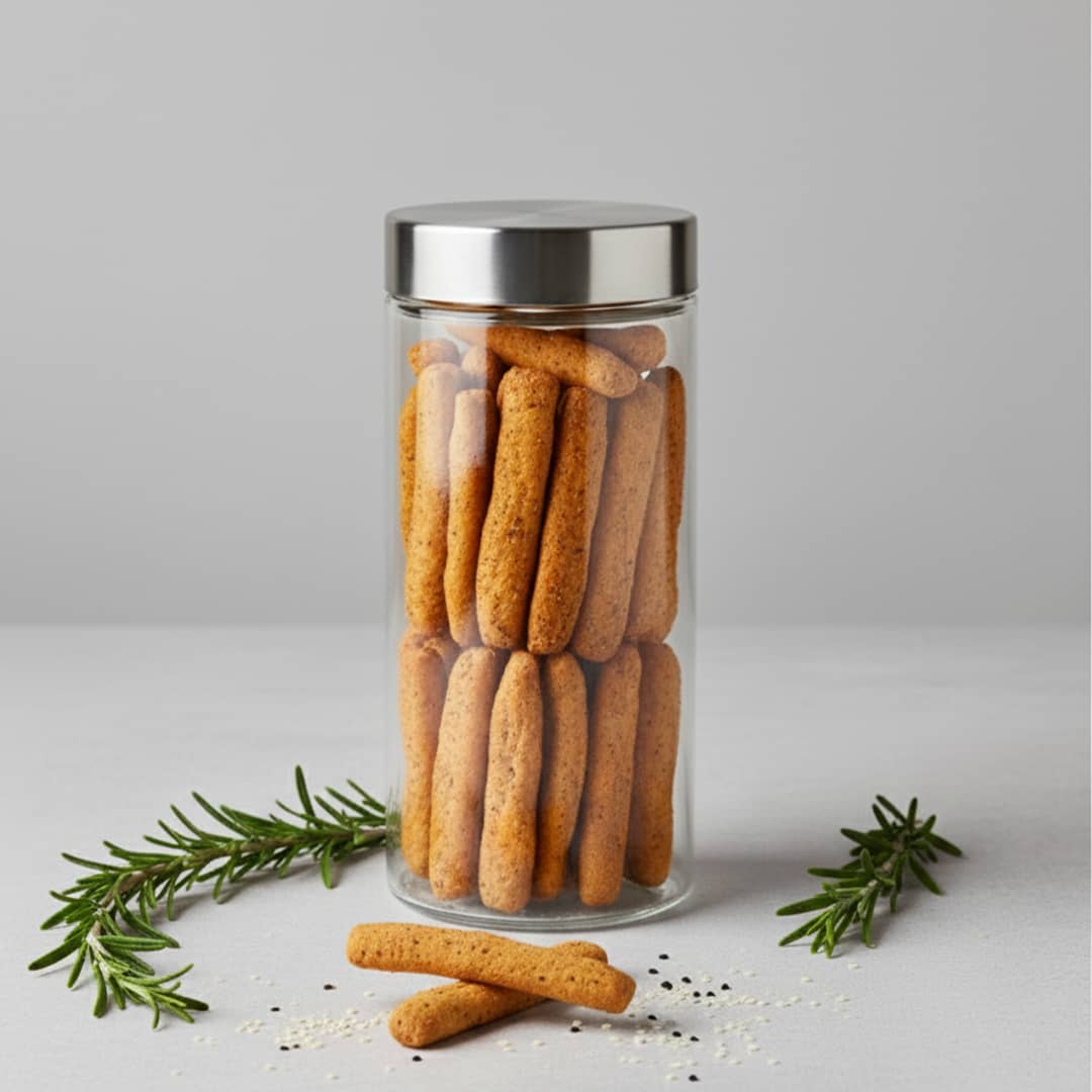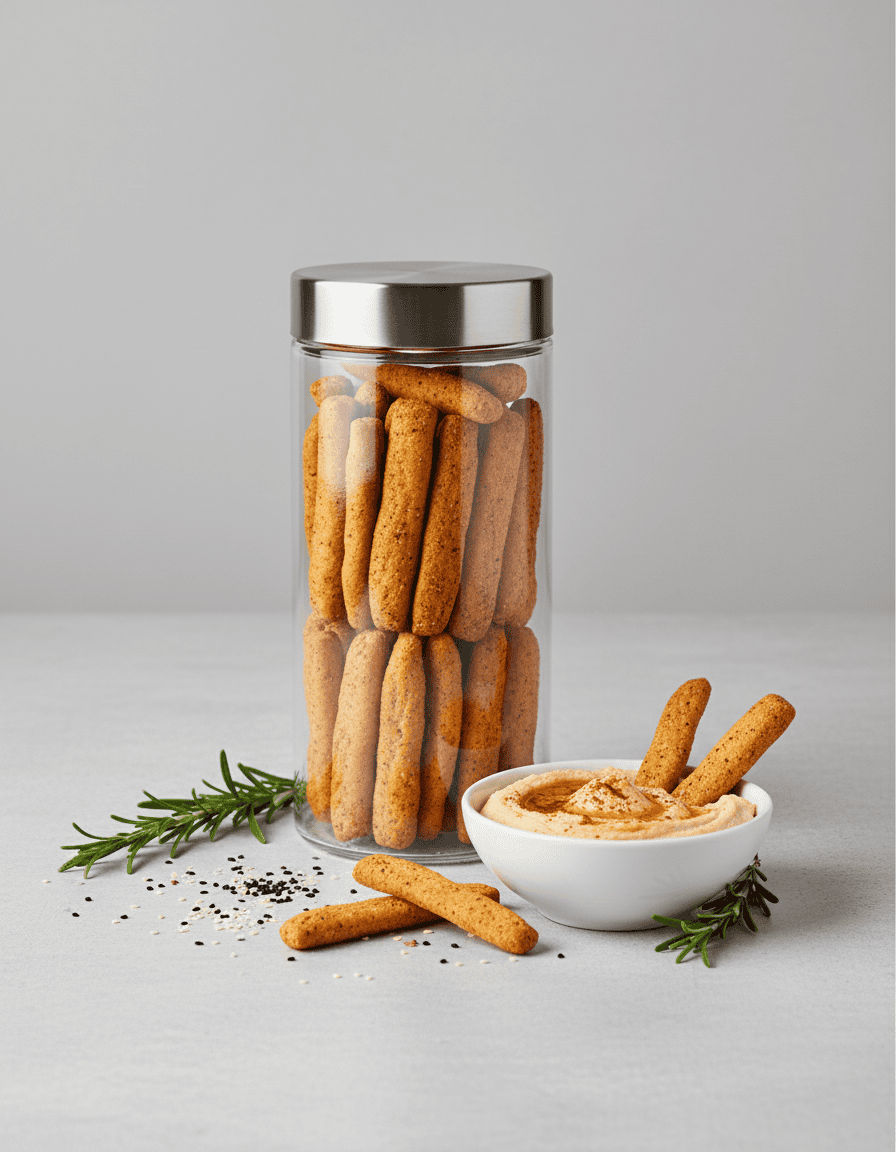 Mini grissini integrali croccanti, ideali come spuntino, per accompagnare zuppe, insalate o aperitivi.
